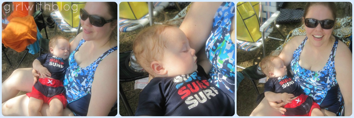 Also, he can fall asleep anywhere, just like his daddy. Not that he does this often (the whole sleeping thing, that is), but it’s happened enough where we know it’s possible. Take this – snoozing on mama at the beach: